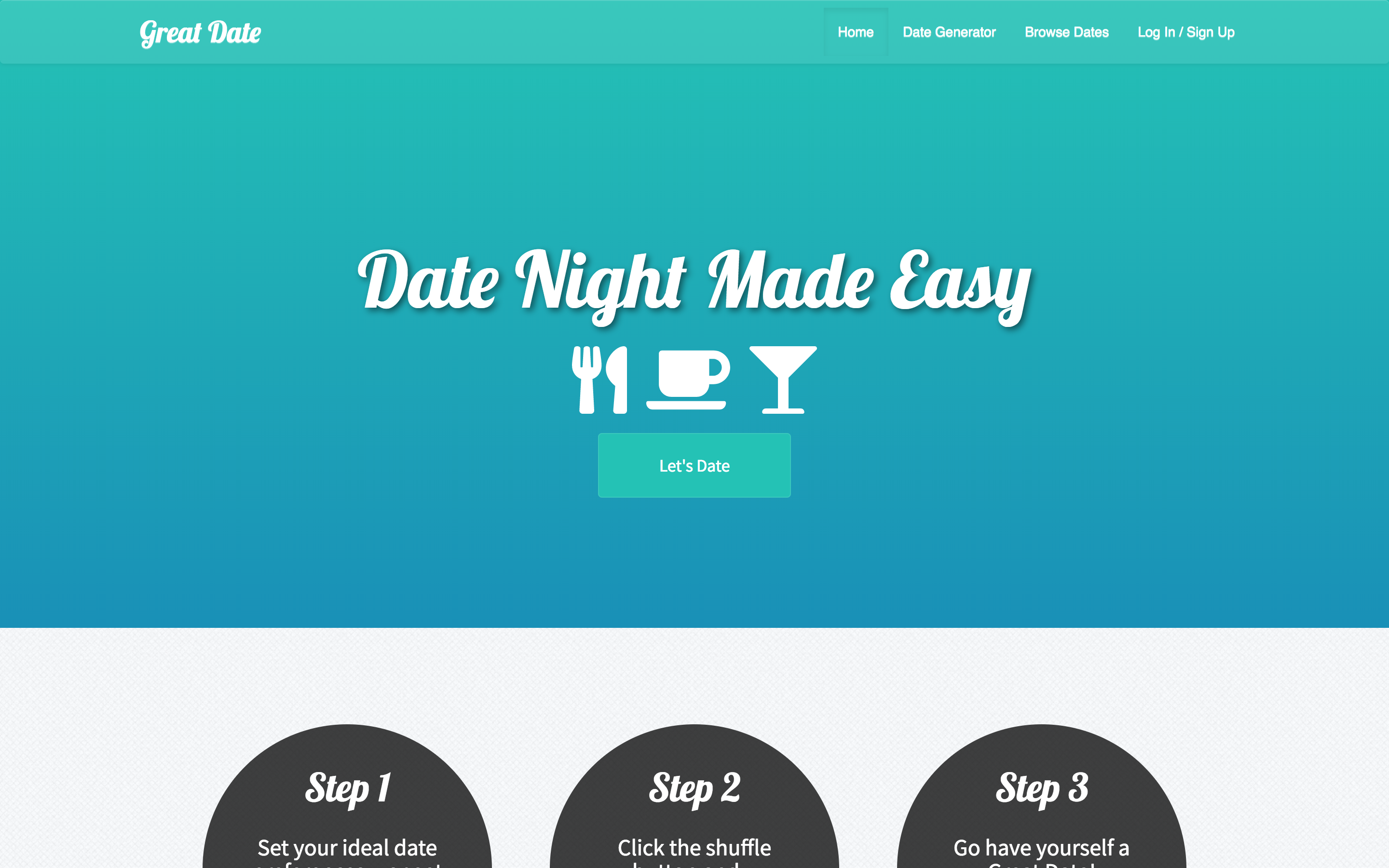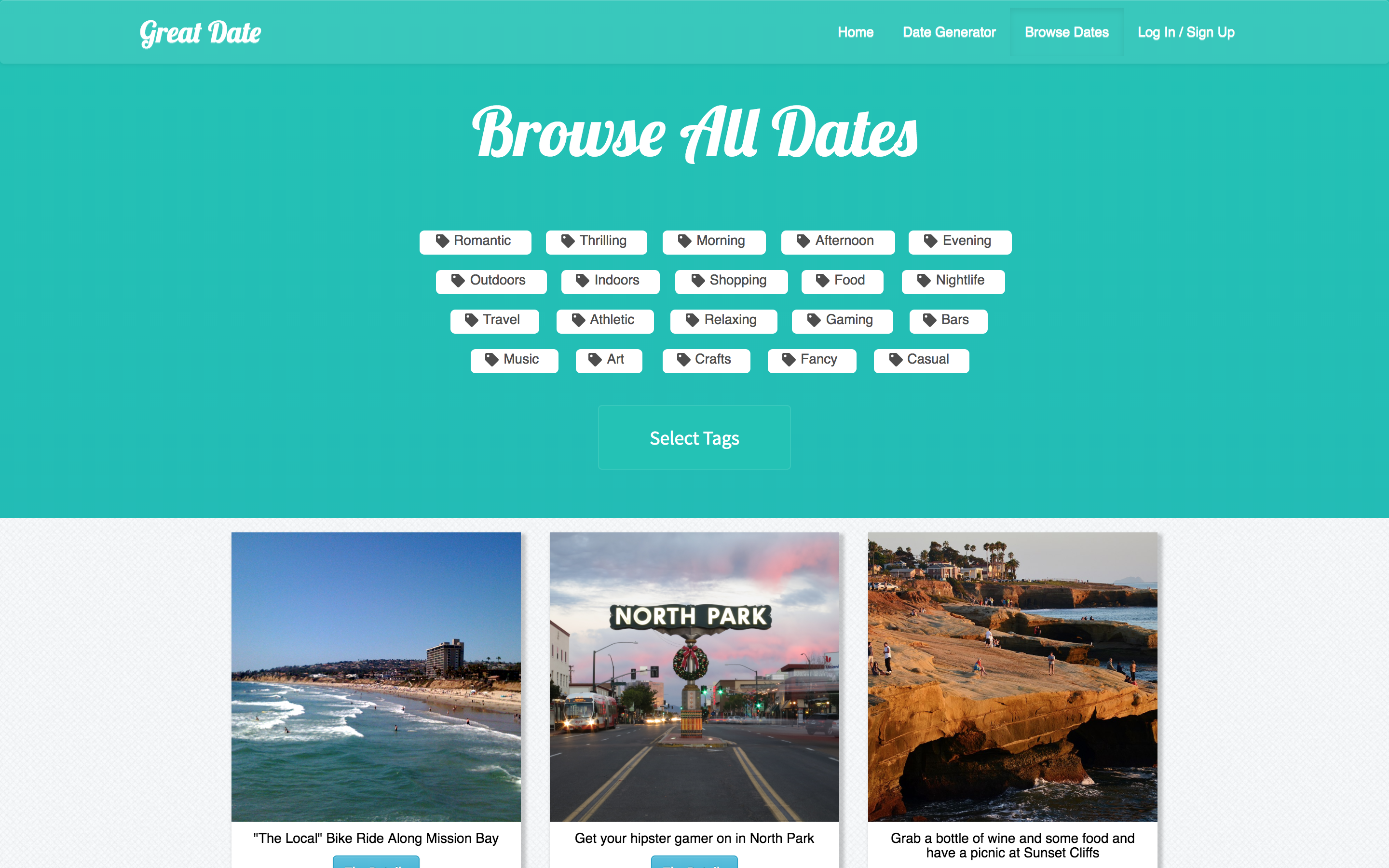 Great Date saves relationships. No more fights over choosing what to eat or what to do. Have a randomly selected activity chosen for you based on tags you select! Log in with your Facebook, Google, or create an account. Join the Great Date community, and contribute a Great Date idea!